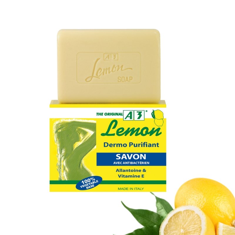 A3 Lemon Soap for washing the body. Dermo - Antibacterial soap for cleansing. Vitamin E with Allantoin. Dermo protecting and moisturizing soap with a 100% vegetable base and a reinforced composition (more pure, rich, creamy). Regular use enhances skin brightness and consistency of complexion. Keep out of children's reach. Italian made.