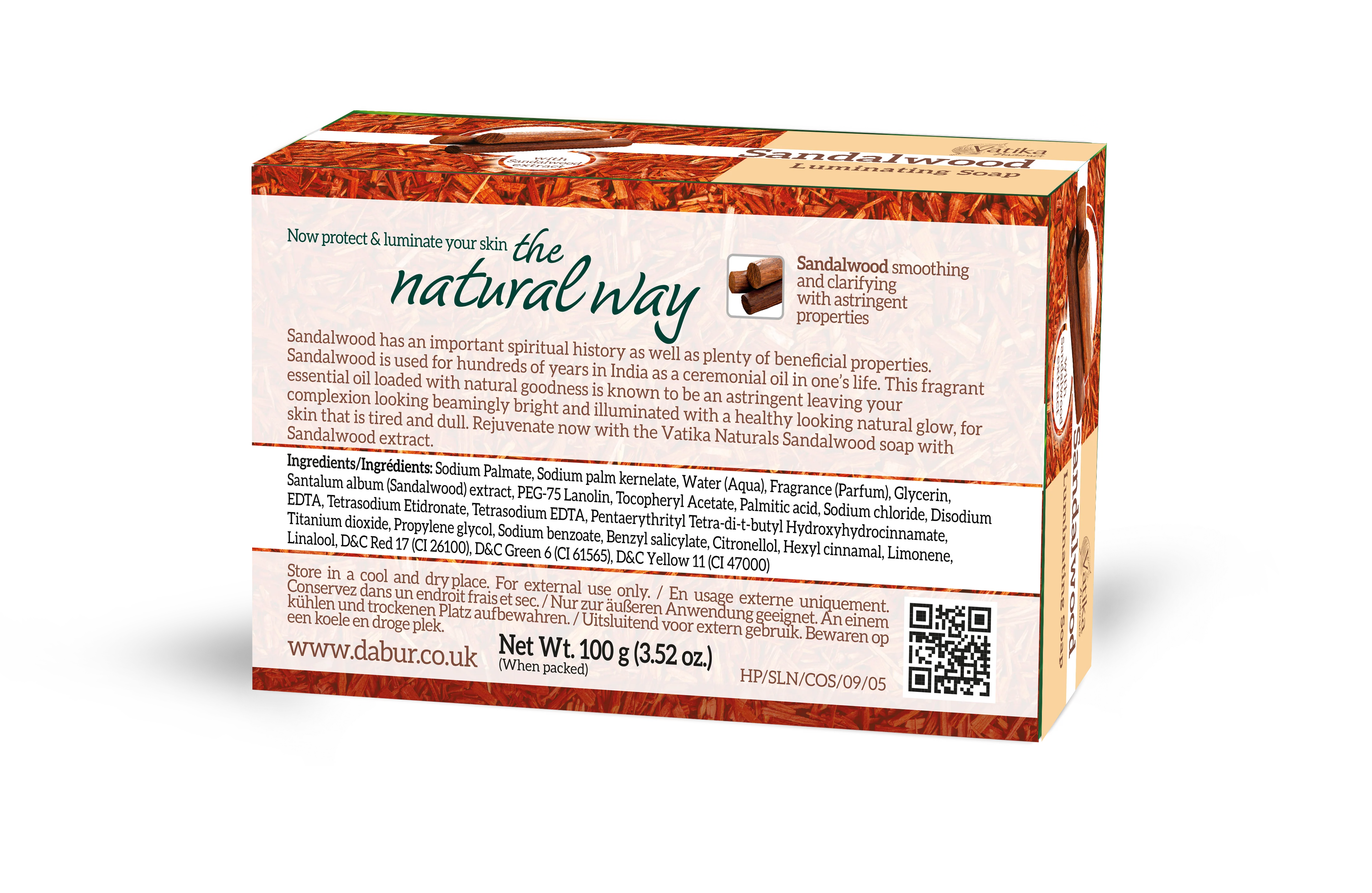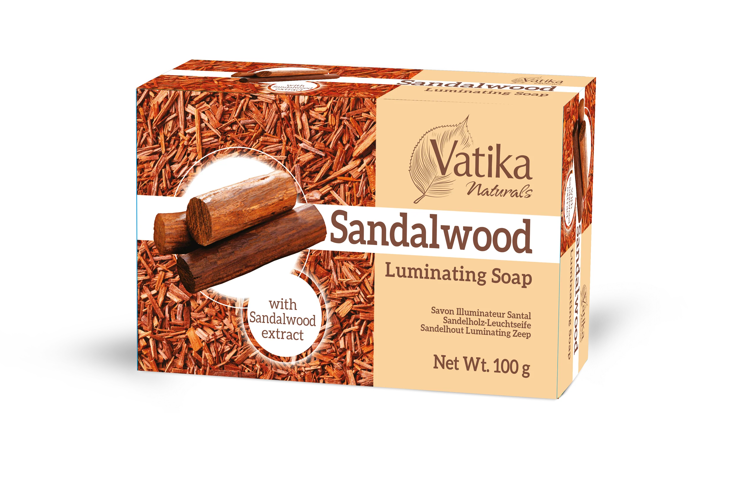 Vatika Naturals Sandalwood Luminating Soap, enriched with pure sandalwood oil, deeply nourishes and enhances skin radiance. Its gentle formula cleanses